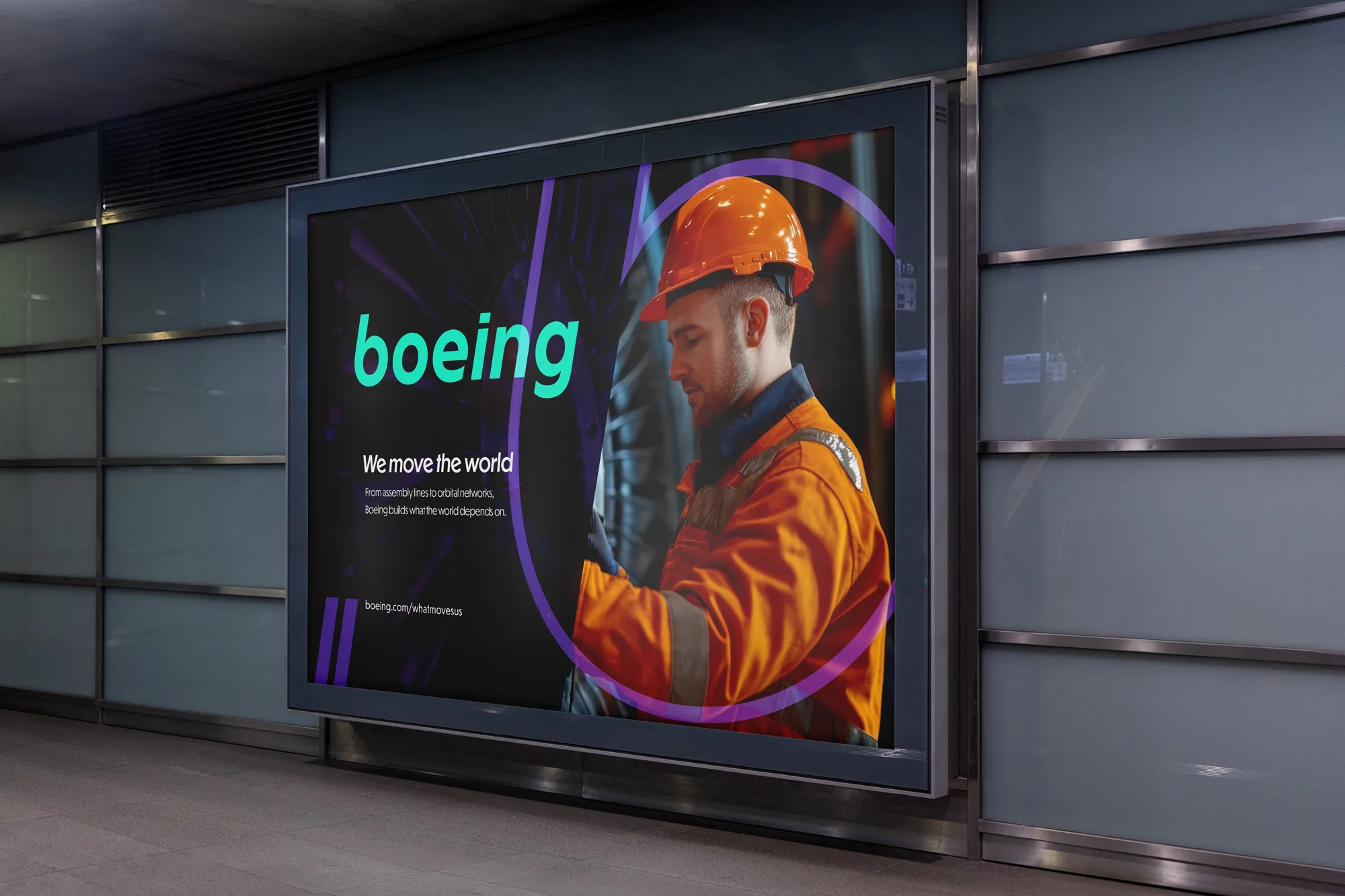 The 'b' mark does two things. As a frame, it places Boeing's people and work at the centre of the brand. Not the aircraft, not the hardware. The humans behind it. As a punchout, it cuts through the mark entirely, letting what Boeing builds speak without the brand getting in the way.