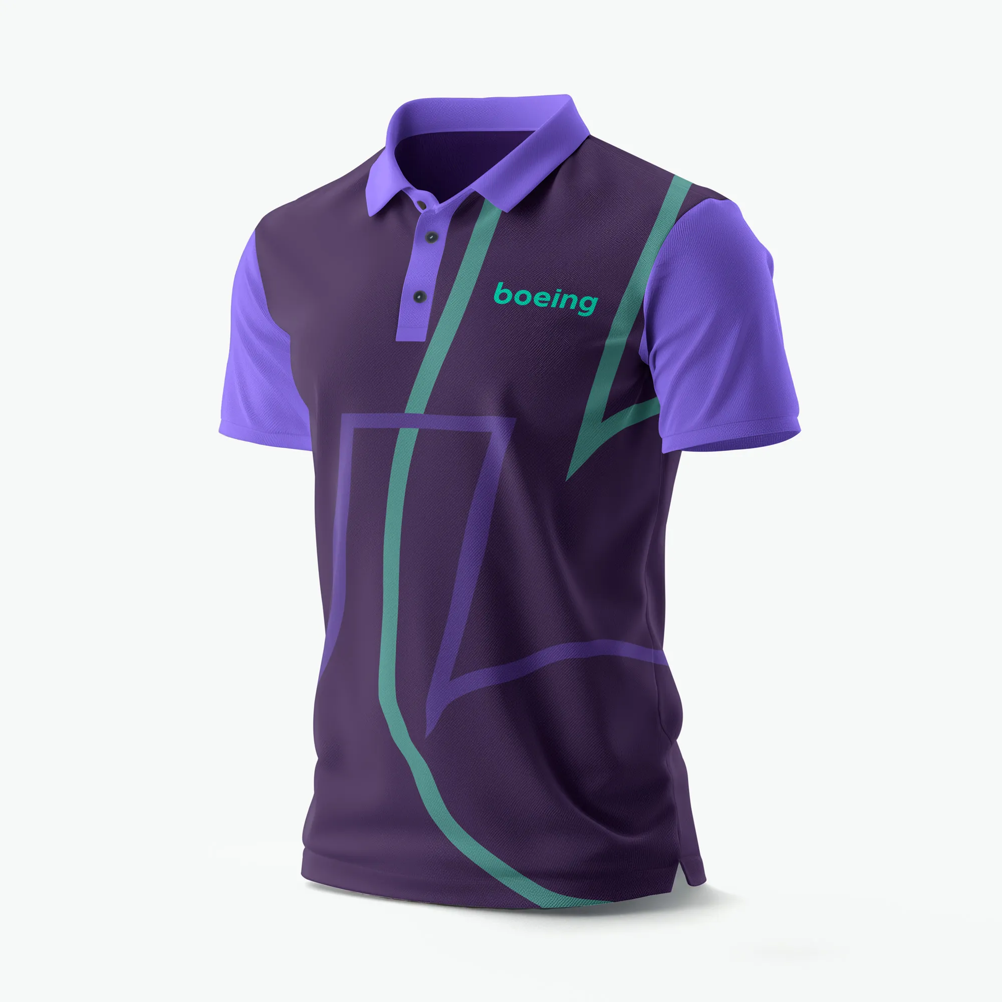 The identity extends to the people who represent Boeing every day. Polos, hard hats, pins, and headwear carry the full colour system and the 'b' mark into the physical world.